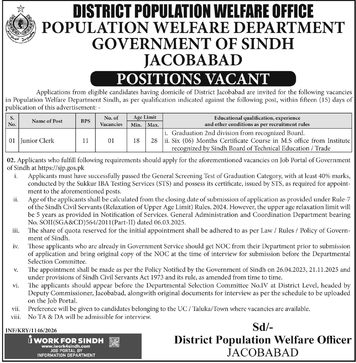 Population Welfare Department PWD Jacobabad Jobs 2026 announce the Contract career opportunities for the post of See Below Ad in Sindh, Jacobabad for the fresh and experienced candidates on Contract basis who have Check Advertisement degree. Posted date of this post is 19/03/2026 and the last date is 02/04/2026. if you are eligible for this job apply before due date.