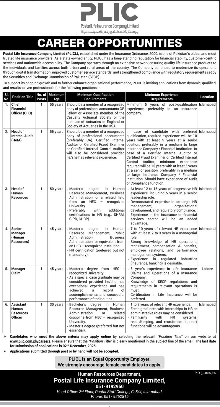 Postal Life Insurance Company Limited Islamabad Jobs 2025 announce the Contract career opportunities for the post of See Below Ad in Federal, Islamabad for the fresh and experienced candidates on Contract basis who have Check Advertisement degree. Posted date of this post is 16/11/2025 and the last date is 02/12/2025. if you are eligible for this job apply before due date.