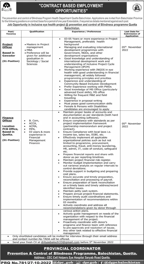 Prevention & control Program Quetta Balochistan Jobs 2022 announce the Contract career opportunities for the post of See Below Ad in Balochistan, Quetta for the fresh and experienced candidates on Contract basis who have Check Advertisement degree. Posted date of this post is 27/10/2022 and the last date is 05/11/2022. if you are eligible for this job apply before due date.