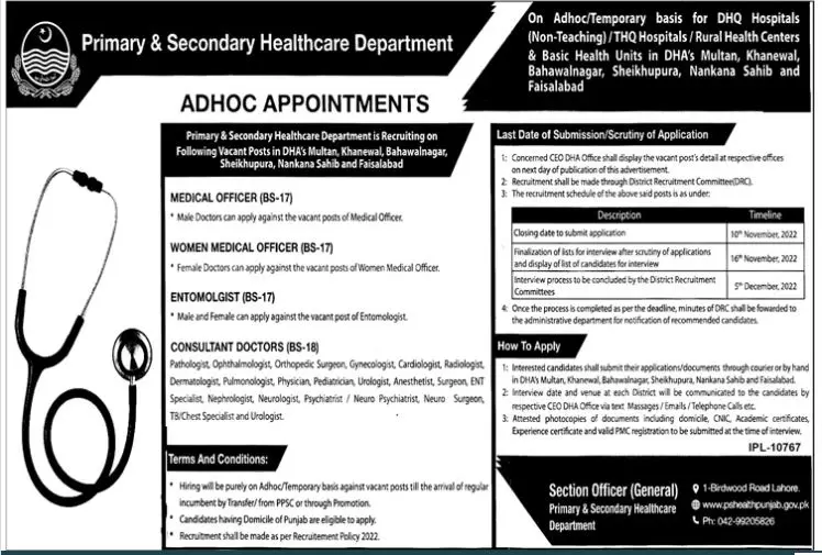 Primary & Secondary Healthcare Department Jobs 2022 announce the Contract career opportunities for the post of See Below Ad in Punjab, Lahore for the fresh and experienced candidates on Contract basis who have Check Advertisement degree. Posted date of this post is 26/10/2022 and the last date is 10/11/2022. if you are eligible for this job apply before due date.
