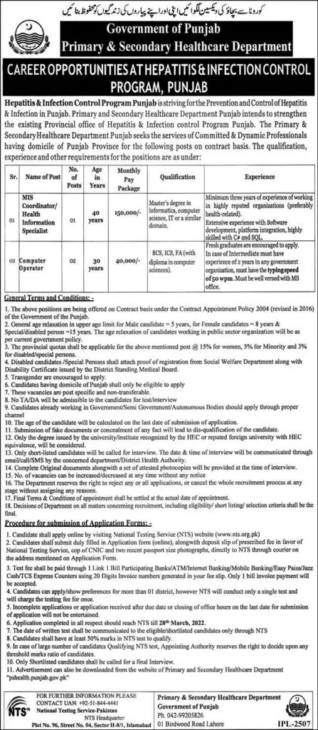 Primary & Secondary Healthcare Department Jobs announce the Contract career opportunities for the post of See Below Ad in Punjab, Lahore for the fresh and experienced candidates on Contract basis who have Check Advertisement degree. Posted date of this post is 10/03/2022 and the last date is 28/03/2022. if you are eligible for this job apply before due date.