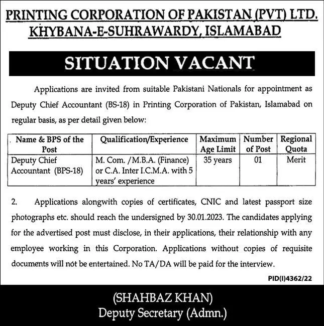 Printing Corporating of Pakistan PVT LTD Jobs 2023 announce the Contract career opportunities for the post of See Below Ad in Federal, Islamabad for the fresh and experienced candidates on Contract basis who have Check Advertisement degree. Posted date of this post is 15/01/2023 and the last date is 30/01/2023. if you are eligible for this job apply before due date.