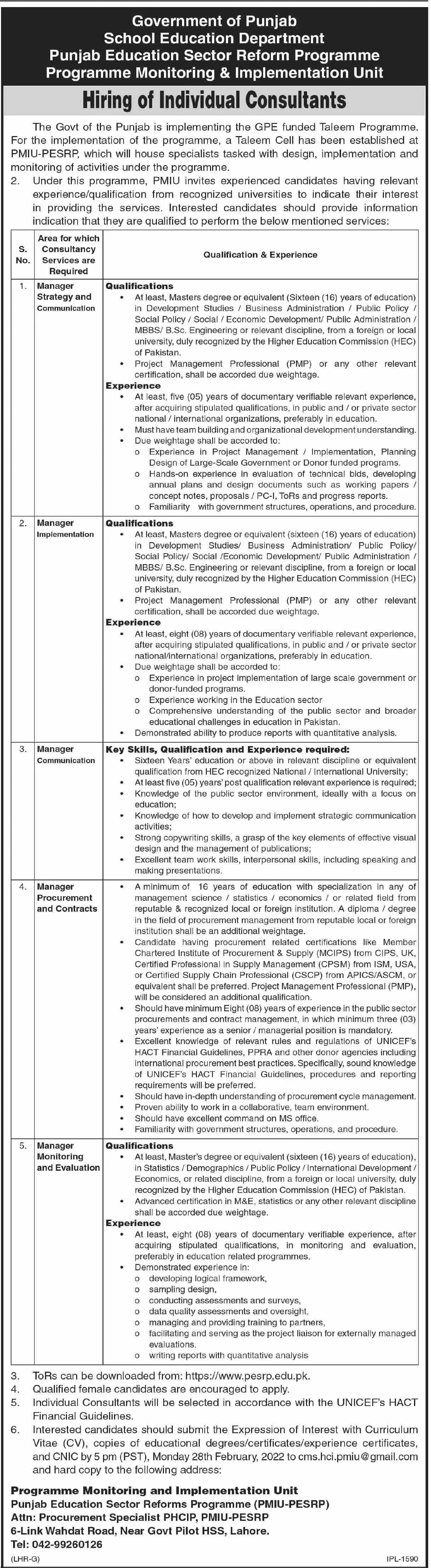 Programme Monitoring & Implementation Unit (PMIU) JOBS announce the Contract career opportunities for the post of See Below Ad in Lahore for the fresh and experienced candidates on Contract basis who have Check Advertisement degree. Posted date of this post is 15/02/2022 and the last date is 28/02/2022. if you are eligible for this job apply before due date.