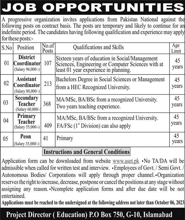 Progressive Organization Islamabad Jobs 2023 announce the Contract career opportunities for the post of See Below Ad in Federal, Islamabad for the fresh and experienced candidates on Contract basis who have Check Advertisement degree. Posted date of this post is 17/09/2023 and the last date is 02/10/2023. if you are eligible for this job apply before due date.