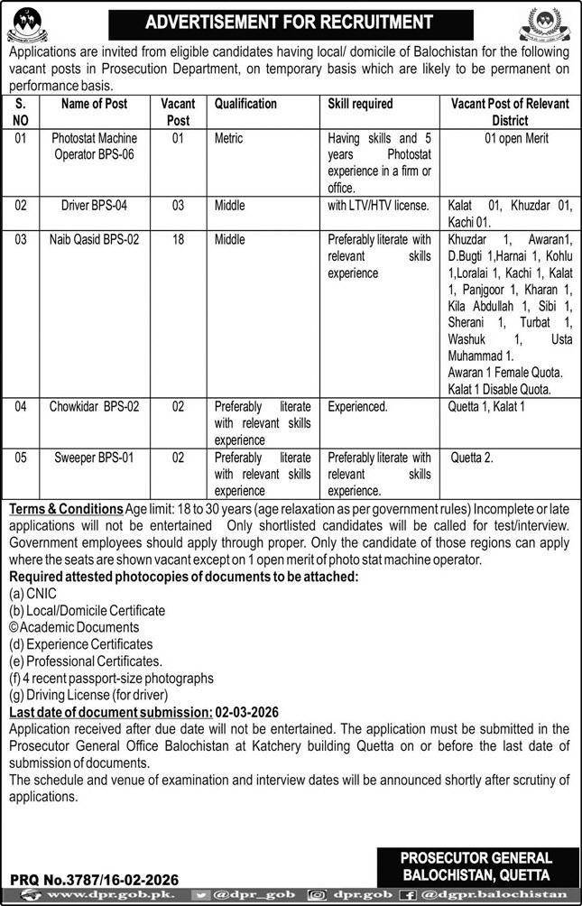 Prosecutor General Balochistan Jobs 2026 For Drivers announce the Contract career opportunities for the post of See Below Ad in Balochistan, Quetta for the fresh and experienced candidates on Contract basis who have Check Advertisement degree. Posted date of this post is 17/02/2026 and the last date is 02/03/2026. if you are eligible for this job apply before due date.