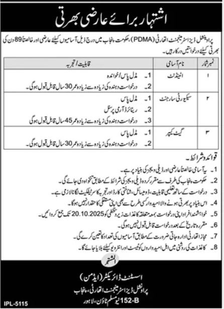 Provincial Disaster Management Authority PDMA Lahore Jobs announce the Contract career opportunities for the post of See Below Ad in Punjab, Lahore for the fresh and experienced candidates on Contract basis who have Check Advertisement degree. Posted date of this post is 10/10/2025 and the last date is 20/10/2025. if you are eligible for this job apply before due date.