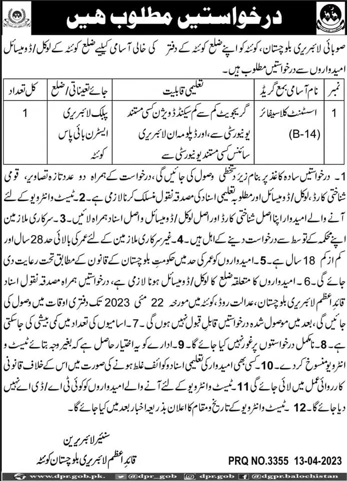 6. Candidates must have local domicile of the concerned district, applications along with certified copies of documents will be received at Quaid-e-Azam Library, Balochistan, Adalat Road, Quetta during office hours till 22 May 2023, applications received later will not be accepted.