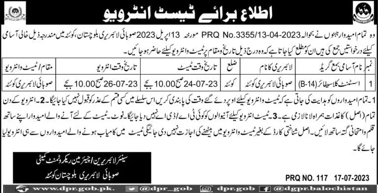 Provincial Library Balochistan Test Interview 2023 announce the Contract career opportunities for the post of See Below Ad in Balochistan, Quetta for the fresh and experienced candidates on Contract basis who have Check Advertisement degree. Posted date of this post is 18/07/2023 and the last date is 26/07/2023. if you are eligible for this job apply before due date.