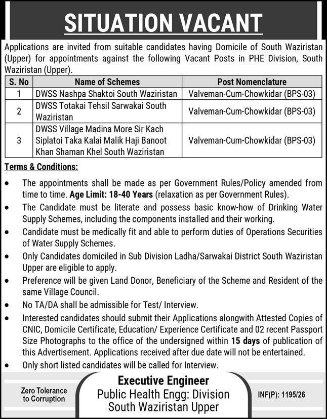 Applications are invited from suitable candidates having Domicile of South Waziristan (Upper) for appointments against the following Vacant Posts in PHE Division, South Waziristan (Upper).