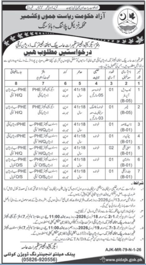 Public Health Engineering Division Kotli Jobs 2025 announce the Contract career opportunities for the post of See Below Ad in Azad Jammu Kashmir, Kotli for the fresh and experienced candidates on Contract basis who have Check Advertisement degree. Posted date of this post is 29/01/2026 and the last date is 13/02/2026. if you are eligible for this job apply before due date.