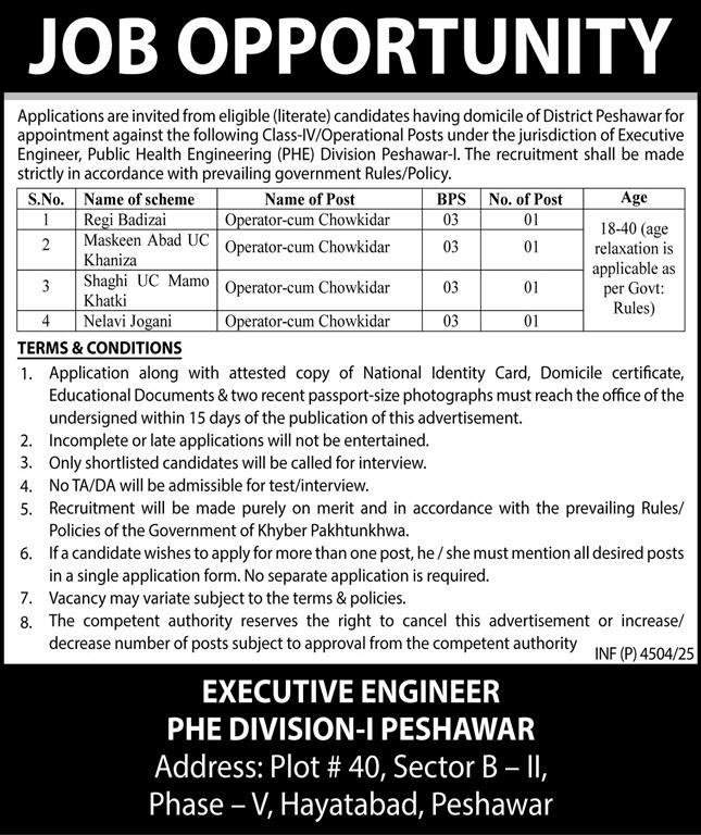 Public Health Engineering Division Peshawar Jobs 2025 announce the Contract career opportunities for the post of See Below Ad in Khyber Pakhtunkhwa, Peshawar for the fresh and experienced candidates on Contract basis who have Check Advertisement degree. Posted date of this post is 23/10/2025 and the last date is 06/11/2025. if you are eligible for this job apply before due date.