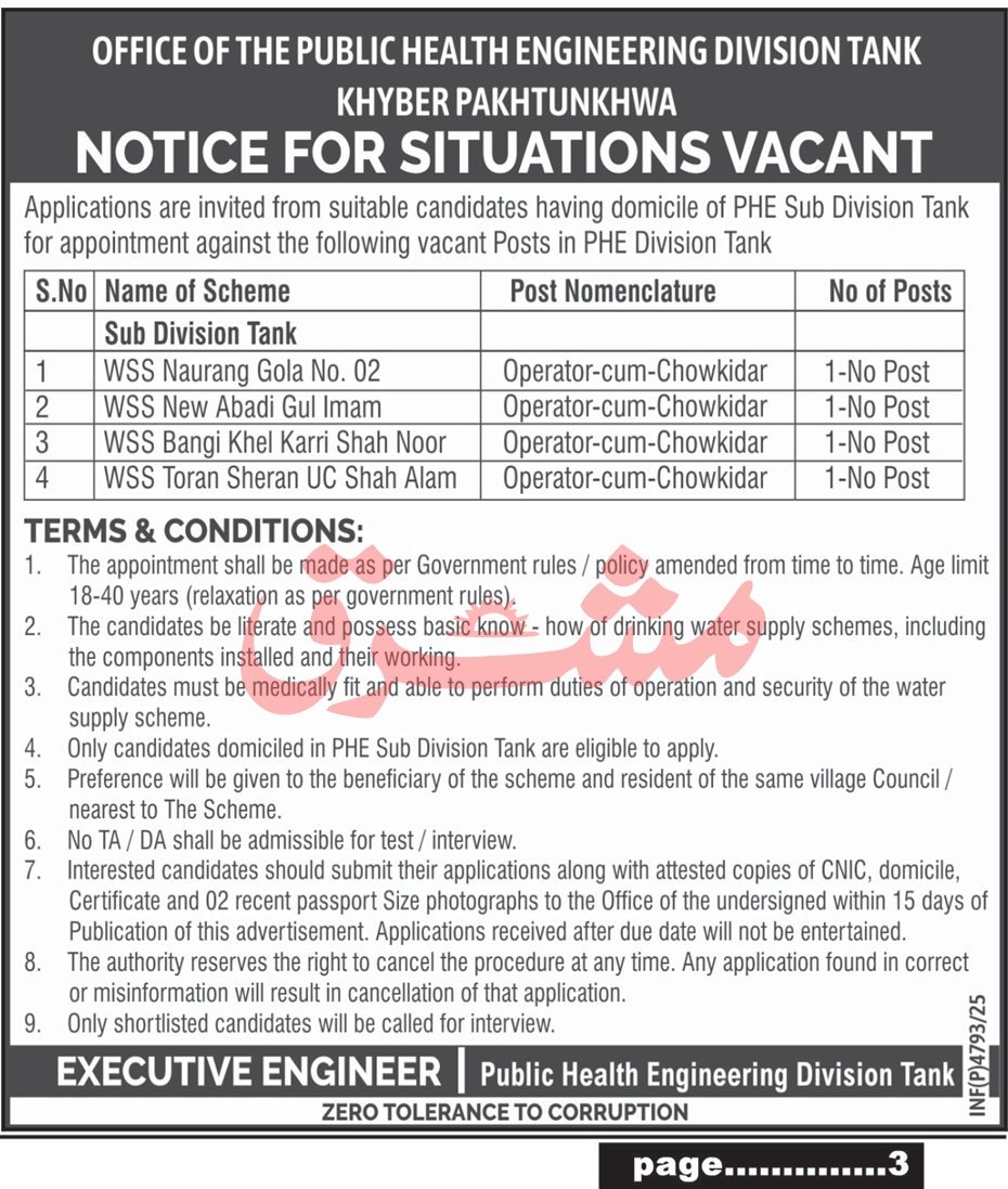 Public Health Engineering Division Tank Job 2025 announce the Contract career opportunities for the post of See Below Ad in Khyber Pakhtunkhwa, Tank for the fresh and experienced candidates on Contract basis who have Check Advertisement degree. Posted date of this post is 14/11/2025 and the last date is 28/11/2025. if you are eligible for this job apply before due date.
