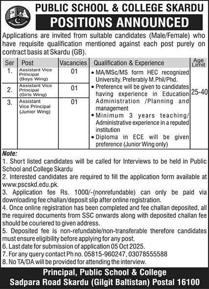 Public School And College Skardu Jobs 2025 announce the Contract career opportunities for the post of See Below Ad in Gilgit Baltistan, Skardu for the fresh and experienced candidates on Contract basis who have Check Advertisement degree. Posted date of this post is 14/09/2025 and the last date is 05/10/2025. if you are eligible for this job apply before due date.