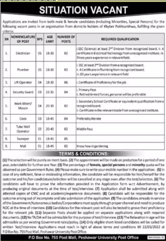 Public Sector Organization Jobs 2022 announce the Contract career opportunities for the post of See Below Ad in Khyber Pakhtunkhwa, Peshawar for the fresh and experienced candidates on Contract basis who have Check Advertisement degree. Posted date of this post is 05/03/2022 and the last date is 22/03/2022. if you are eligible for this job apply before due date.