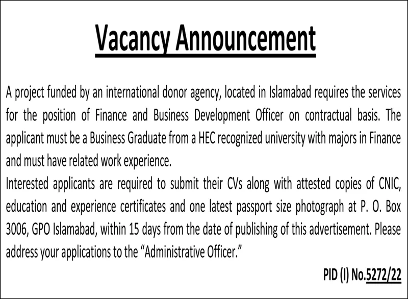 - Interested applicants are required to submit their CVs along with attested copies of CNIC, education and experience certificates and one latest passport size photograph at P. O. Box 3006, GPO Islamabad, within 15 days from the date of publishing of this advertisement.