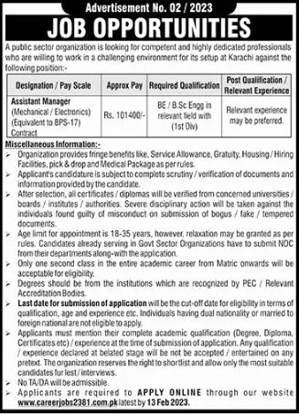 Public Sector Organization Karachi Jobs 2023 announce the Contract career opportunities for the post of See Below Ad in Sindh, Karachi for the fresh and experienced candidates on Contract basis who have Check Advertisement degree. Posted date of this post is 29/01/2023 and the last date is 13/02/2023. if you are eligible for this job apply before due date.