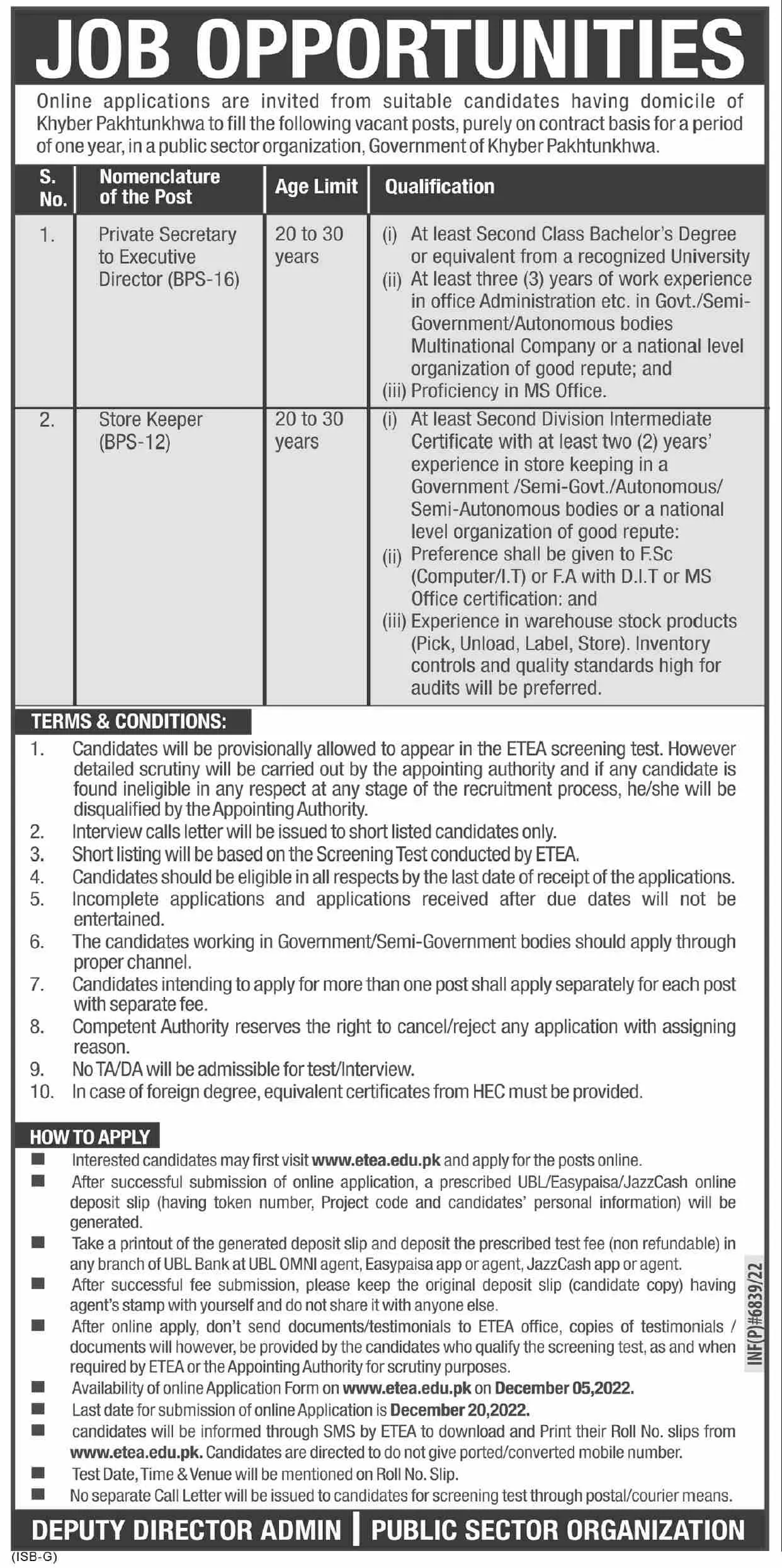 - Public Sector Organization Government of Khyber Pakhtunkhwa is looking for Private Secretary and Store Keeper. These positions require the following qualifications and experience: