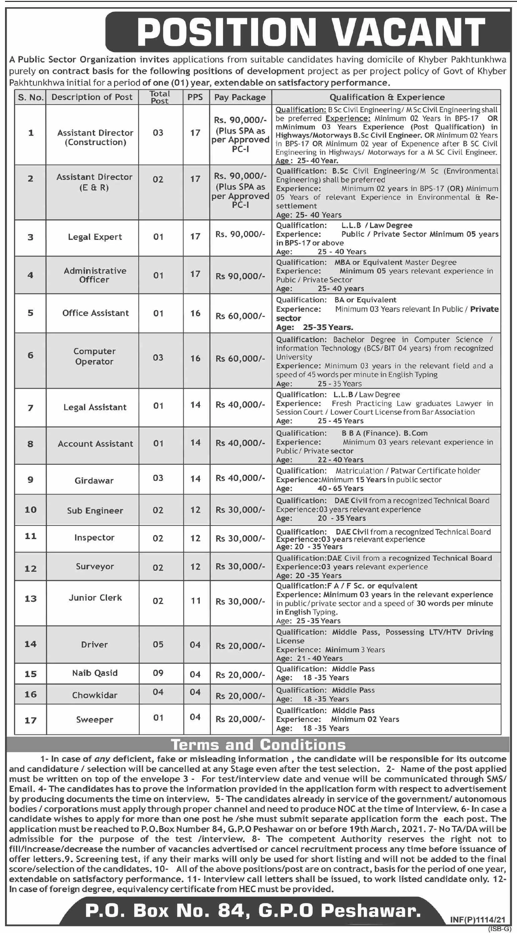 Public Sector Organization Kpk Jobs 2021 announce the Permanent career opportunities for the post of See Below Ad in Khyber Pakhtunkhwa,Peshawar for the fresh and experienced candidates on Permanent basis who have Check Advertisement degree. Posted date of this post is 06/03/2021 and the last date is 19/03/2021. if you are eligible for this job apply before due date.