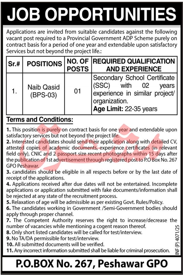 Public Sector Organization Peshawar Jobs 2025 announce the Contract career opportunities for the post of See Below Ad in Khyber Pakhtunkhwa, Peshawar for the fresh and experienced candidates on Contract basis who have Check Advertisement degree. Posted date of this post is 27/09/2025 and the last date is 12/10/2025. if you are eligible for this job apply before due date.