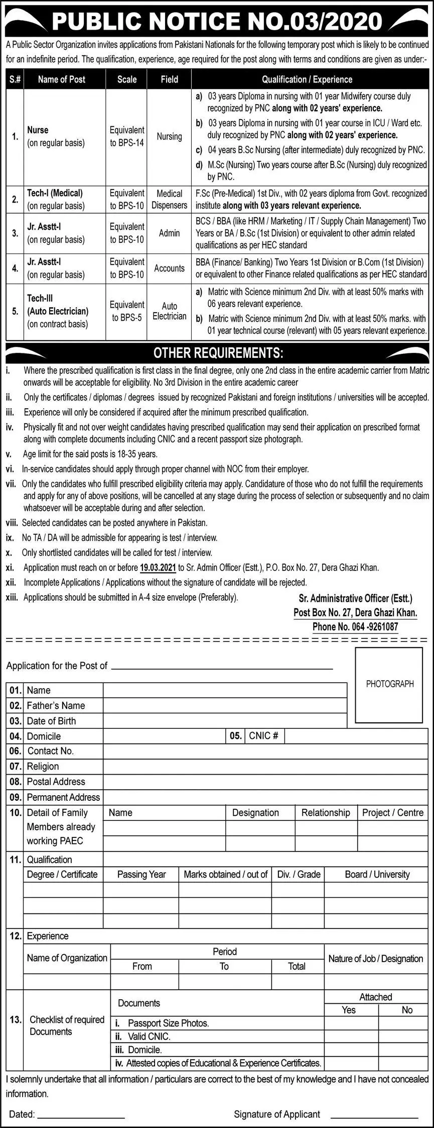 Public Sector Organization Punjab Jobs 2021 announce the Permanent career opportunities for the post of See Below Ad in Punjab,Dera Ghazi Khan for the fresh and experienced candidates on Permanent basis who have Check Advertisement degree. Posted date of this post is 28/02/2021 and the last date is 19/03/2021. if you are eligible for this job apply before due date.