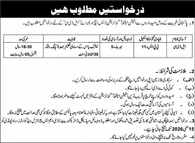 1. Applications are invited from Pakistani citizens for the post of "LDC" (Lower Division Clerk) in the Station Health Organization (SHO).