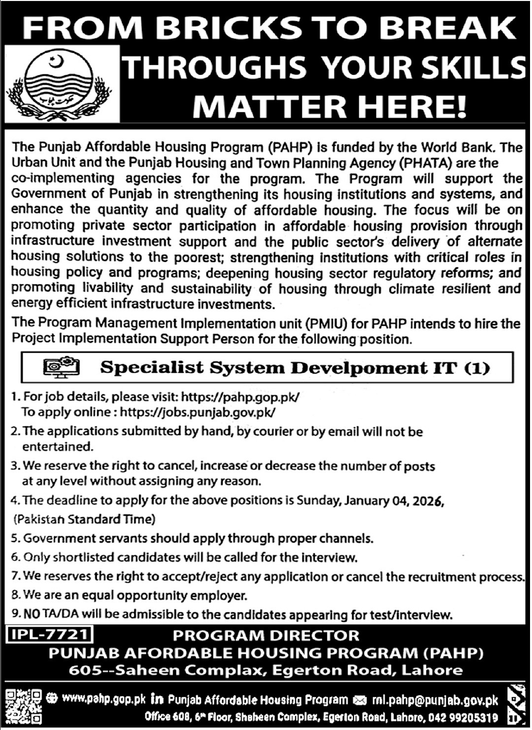 Punjab Affordable Housing Program PAHP Jobs 2025 announce the Contract career opportunities for the post of See Below Ad in Punjab, Lahore for the fresh and experienced candidates on Contract basis who have Check Advertisement degree. Posted date of this post is 21/12/2025 and the last date is 05/01/2026. if you are eligible for this job apply before due date.