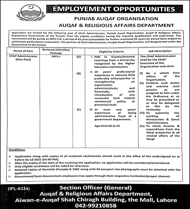 Application are invited for the following post of Chief Administrator, Punjab Auqaf Organisation, Auqaf & Religious Affairs Department Government of the Punjab, from the eligible candidates having the requisite qualification and experience. The recruitment will be purely on MPS-1 for a period of 03 years (extendable for further maximum 02 years on annual basis subject to satisfactory performance evaluation). The position of Chief Administrator, Punjab Auqaf Organisation, will be governed under the Government of the Punjab.
