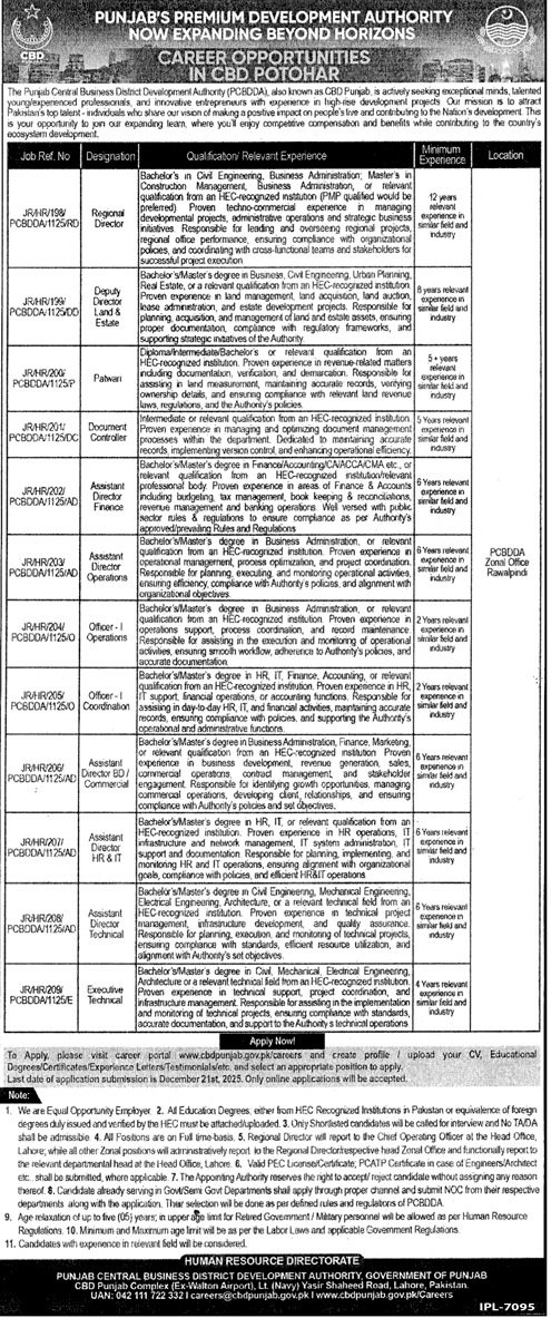 PUNJAB CENTRAL BUSINESS DISTRICT DEVELOPMENT AUTHORITY Jobs announce the Contract career opportunities for the post of See Below Ad in Punjab, Lahore for the fresh and experienced candidates on Contract basis who have Check Advertisement degree. Posted date of this post is 07/12/2025 and the last date is 21/12/2025. if you are eligible for this job apply before due date.