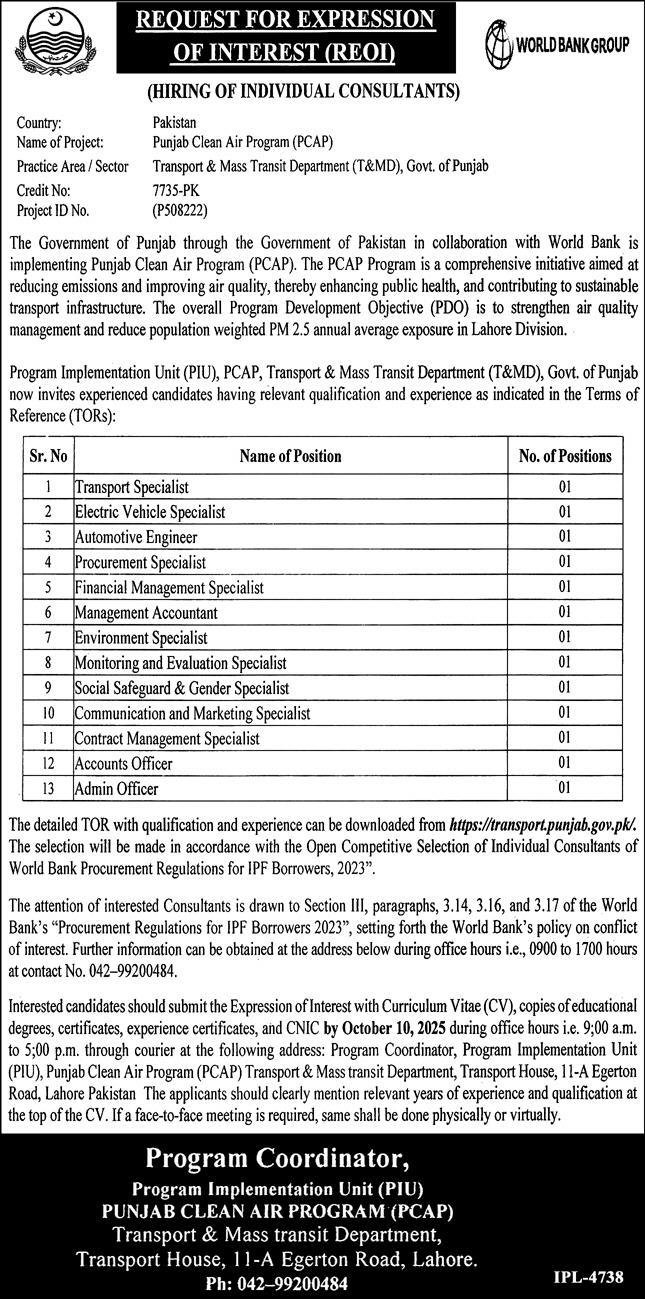 Punjab Clean Air Program PCAP Lahore Jobs 2025 announce the Contract career opportunities for the post of See Below Ad in Punjab, Lahore for the fresh and experienced candidates on Contract basis who have Check Advertisement degree. Posted date of this post is 23/09/2025 and the last date is 10/10/2025. if you are eligible for this job apply before due date.