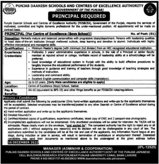 Punjab Daanish Schools & Center Of Excellence Authority Jobs announce the Contract career opportunities for the post of See Below Ad in Punjab, Lahore for the fresh and experienced candidates on Contract basis who have Check Advertisement degree. Posted date of this post is 10/12/2022 and the last date is 16/12/2022. if you are eligible for this job apply before due date.