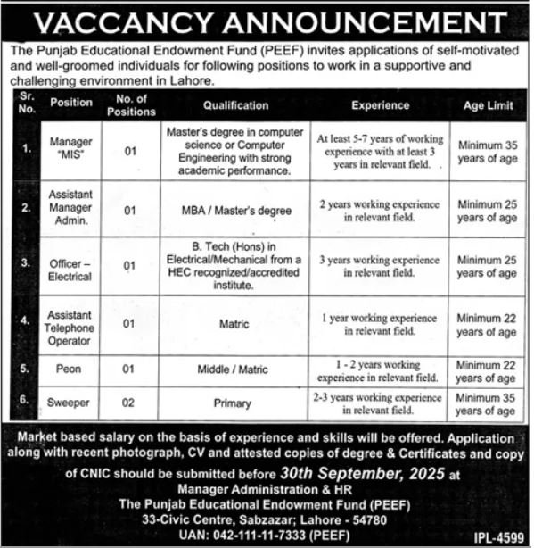 Punjab Education Endowment Fund PEEF Jobs 2025 announce the Contract career opportunities for the post of See Below Ad in Punjab, Lahore for the fresh and experienced candidates on Contract basis who have Check Advertisement degree. Posted date of this post is 13/09/2025 and the last date is 30/09/2025. if you are eligible for this job apply before due date.