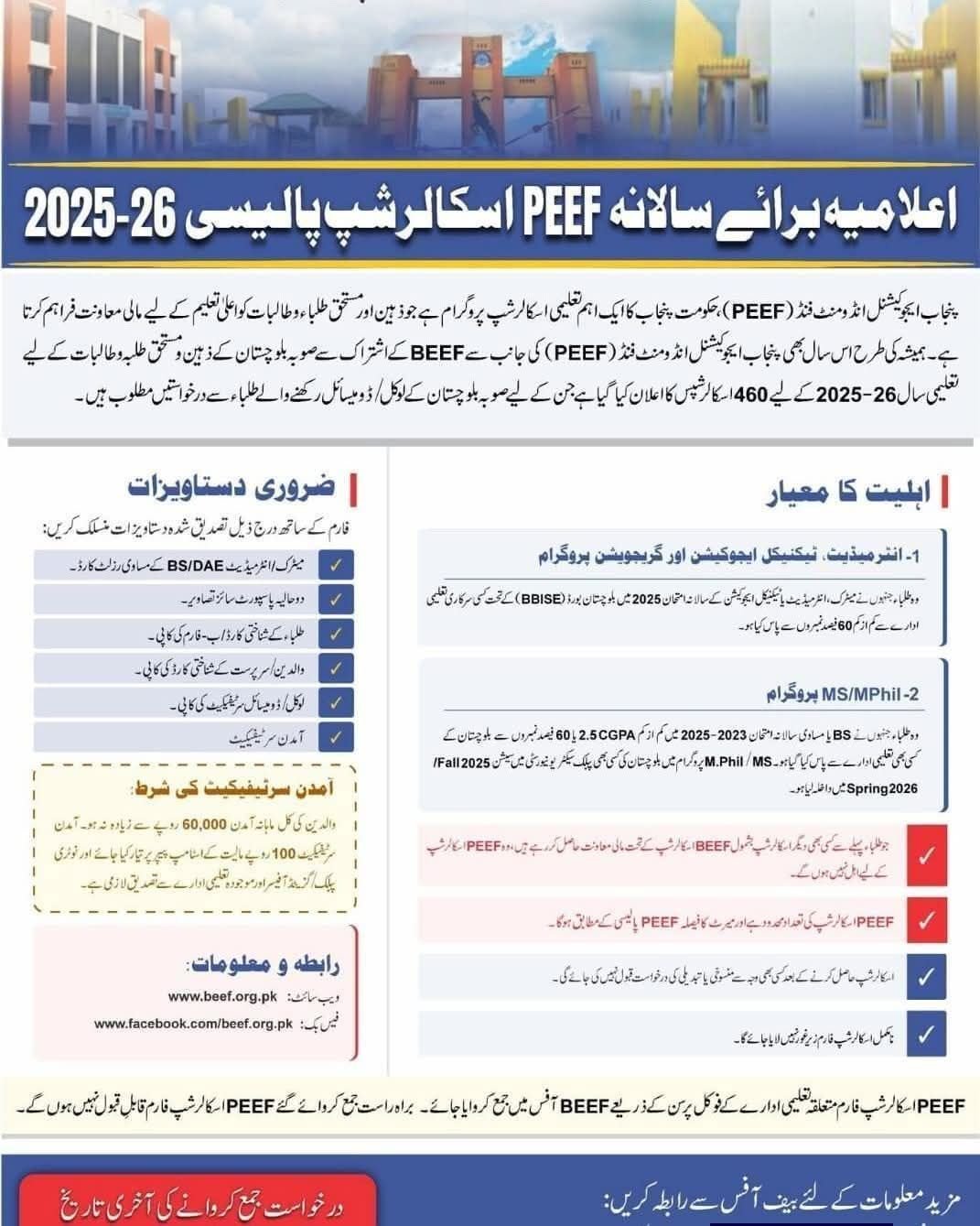 The Punjab Educational Endowment Fund (PEEF) is an important educational scholarship program of the Government of Punjab that provides financial assistance to intelligent and deserving male and female students for higher education. As always, this year too, PEEF, in collaboration with BEEF, has announced 460 scholarships for intelligent and deserving male and female students of Balochistan province for the academic year 2025-26, for which applications from students holding a local domicile of Balochistan province are required.