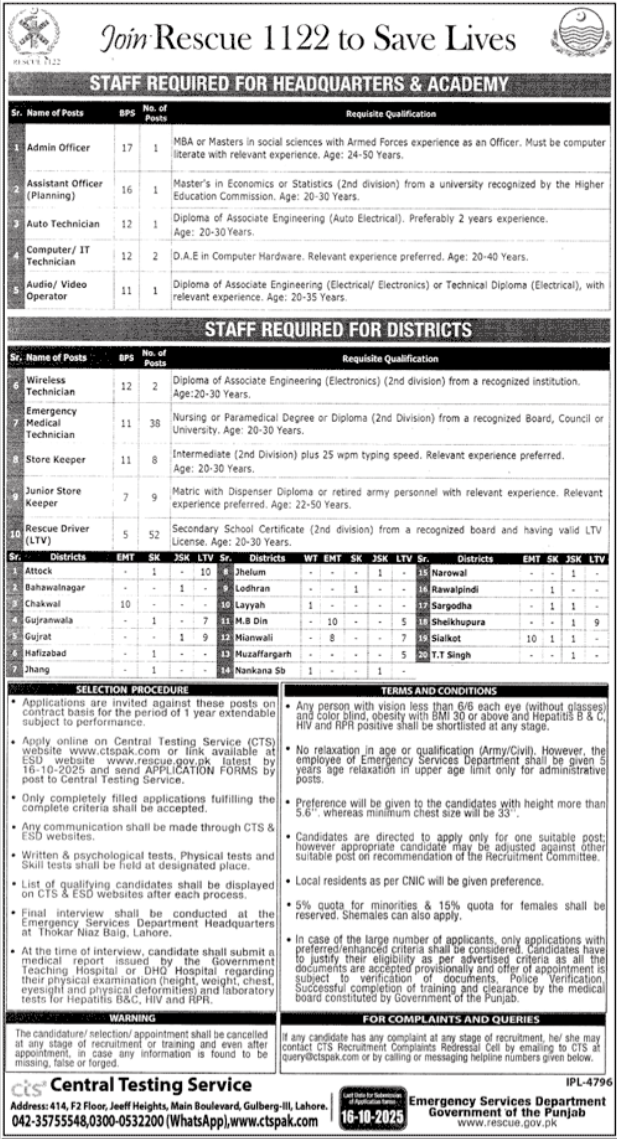 Punjab Emergency Service Rescue 1122 Jobs 2025 announce the Contract career opportunities for the post of See Below Ad in Punjab, Lahore for the fresh and experienced candidates on Contract basis who have Check Advertisement degree. Posted date of this post is 27/09/2025 and the last date is 16/10/2025. if you are eligible for this job apply before due date.
