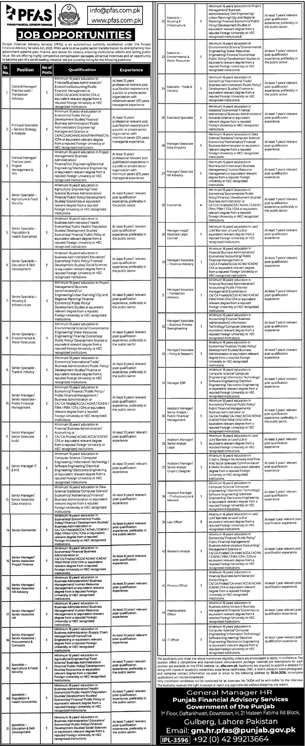Punjab Financial Advisory Services PFAS Lahore Jobs announce the Contract career opportunities for the post of See Below Ad in Punjab, Lahore for the fresh and experienced candidates on Contract basis who have Check Advertisement degree. Posted date of this post is 14/04/2026 and the last date is 30/04/2026. if you are eligible for this job apply before due date.