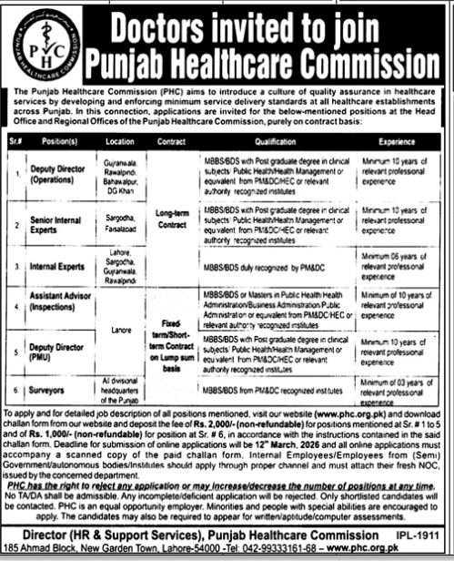 Punjab Healthcare Commission (PHC) Jobs 2026 announce the Contract career opportunities for the post of See Below Ad in Punjab, Lahore for the fresh and experienced candidates on Contract basis who have Check Advertisement degree. Posted date of this post is 23/02/2026 and the last date is 12/03/2026. if you are eligible for this job apply before due date.