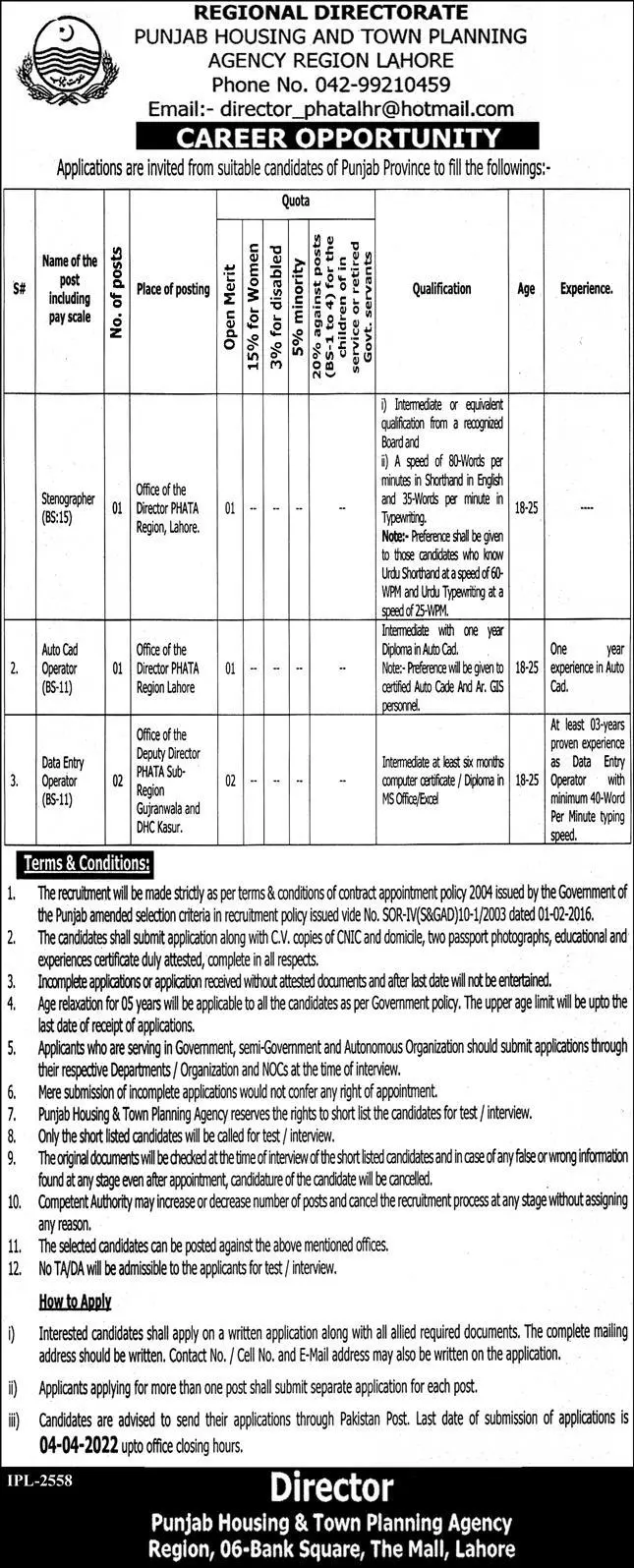 Punjab Housing and Town Planning Agency Jobs announce the Contract career opportunities for the post of See Below Ad in Punjab, Lahore for the fresh and experienced candidates on Contract basis who have Check Advertisement degree. Posted date of this post is 11/03/2022 and the last date is 04/04/2022. if you are eligible for this job apply before due date.