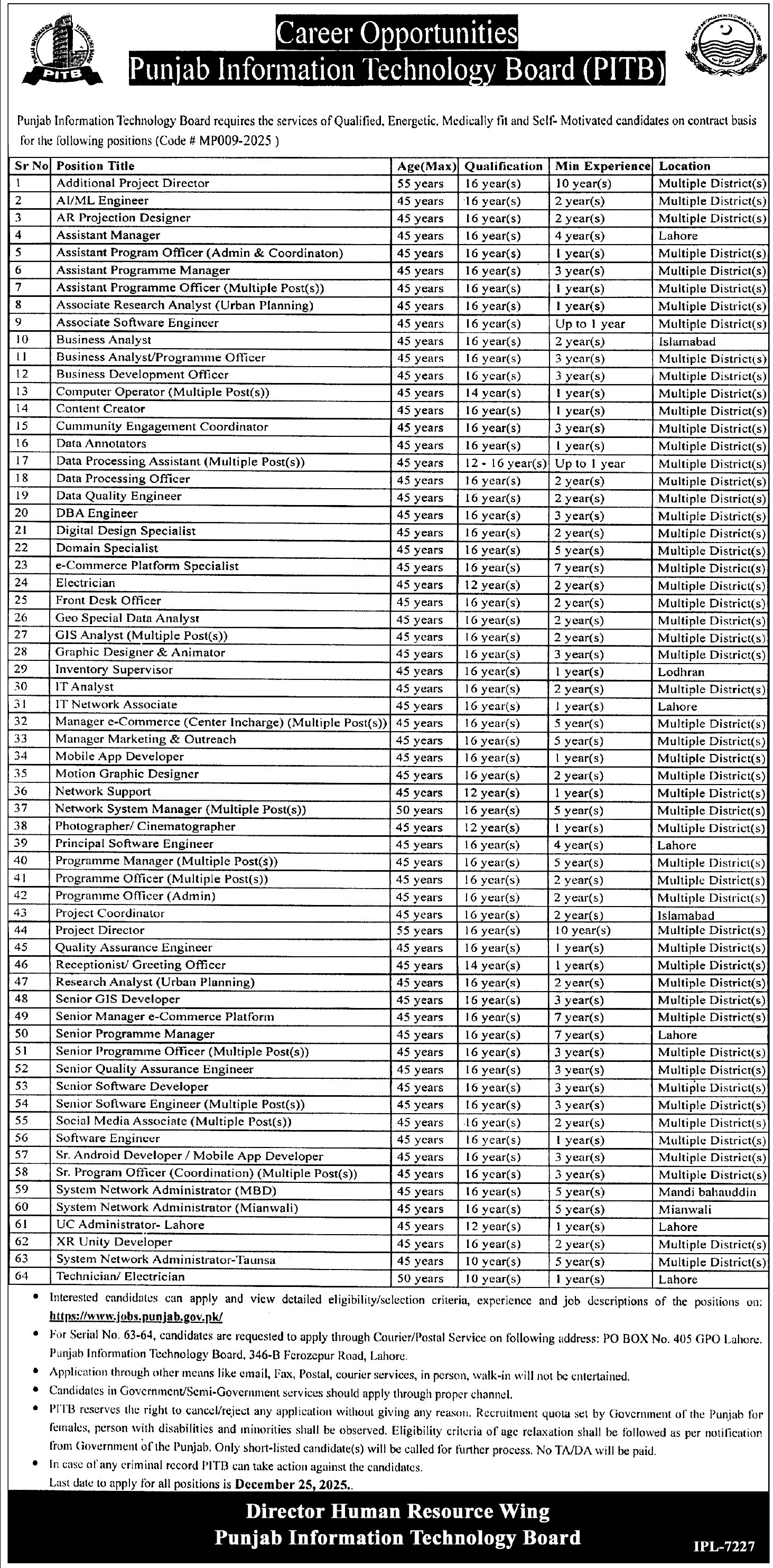 Punjab Information Technology Board PITB Jobs 2025 announce the Contract career opportunities for the post of See Below Ad in Punjab, Lahore for the fresh and experienced candidates on Contract basis who have Check Advertisement degree. Posted date of this post is 10/12/2025 and the last date is 25/12/2025. if you are eligible for this job apply before due date.