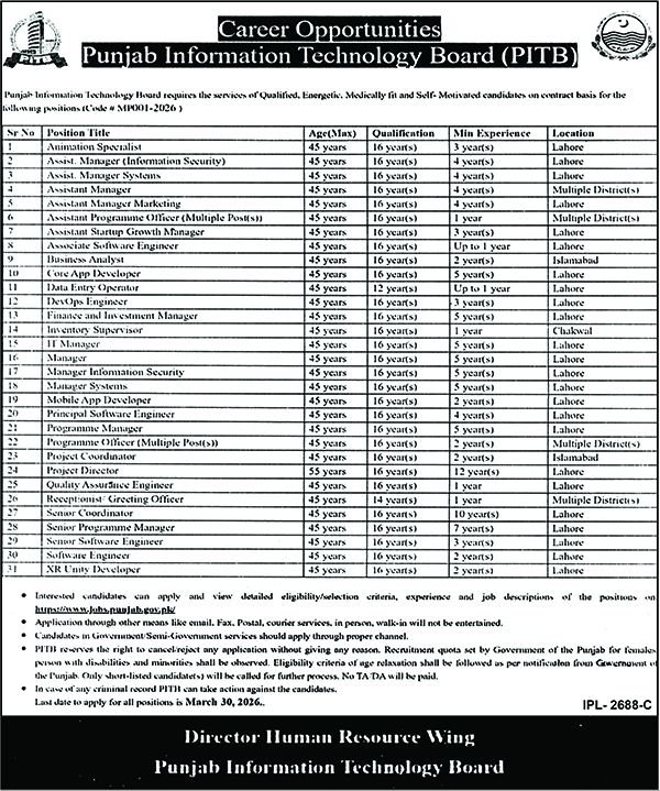 Punjab Information Technology Board requires the services of Qualified, Energetic, Medically fit and Self-Motivated candidates on contract basis for the following positions (Code # MP001-2026)