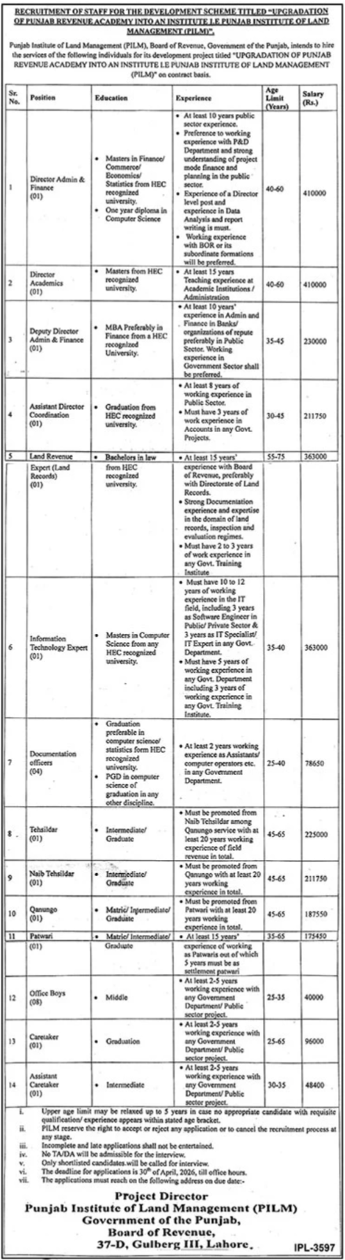 Punjab Institute Of Land Management PILM Lahore Jobs 2026 announce the Contract career opportunities for the post of See Below Ad in Punjab, Lahore for the fresh and experienced candidates on Contract basis who have Check Advertisement degree. Posted date of this post is 14/04/2026 and the last date is 30/04/2026. if you are eligible for this job apply before due date.