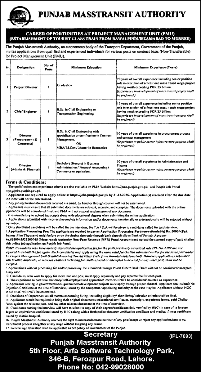 Punjab Masstransit Authority PMA Lahore Jobs 2025 announce the Contract career opportunities for the post of See Below Ad in Punjab, Lahore for the fresh and experienced candidates on Contract basis who have Check Advertisement degree. Posted date of this post is 06/12/2025 and the last date is 21/12/2025. if you are eligible for this job apply before due date.