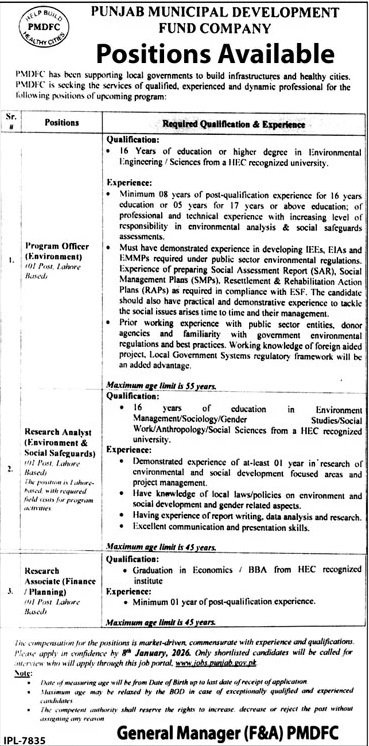 Punjab Muncipal Development Fund Company Jobs 2026 announce the Contract career opportunities for the post of See Below Ad in Punjab, Lahore for the fresh and experienced candidates on Contract basis who have Check Advertisement degree. Posted date of this post is 24/12/2025 and the last date is 08/01/2026. if you are eligible for this job apply before due date.