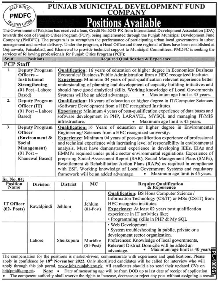 Punjab Municipal Development Fund Company Jobs 2022 announce the Contract career opportunities for the post of See Below Ad in Punjab,Lahore for the fresh and experienced candidates on Contract basis who have Check Advertisement degree. Posted date of this post is 27/10/2022 and the last date is 18/11/2022. if you are eligible for this job apply before due date.