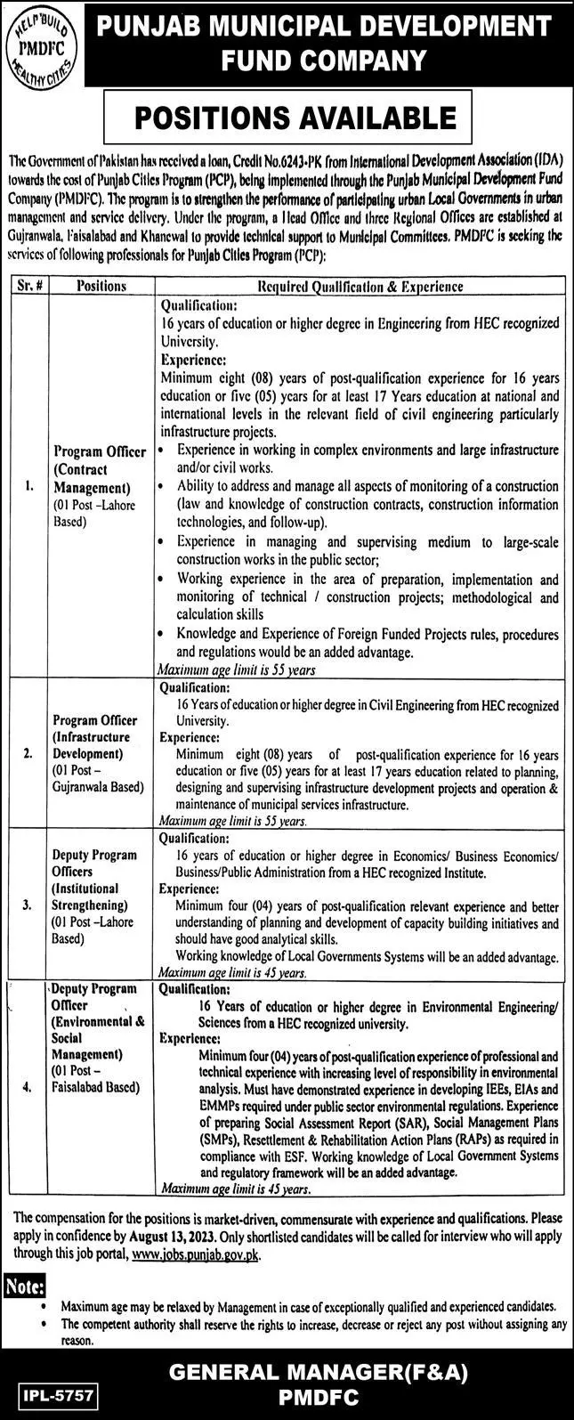 Punjab Municipal Development Fund Company Jobs 2023 announce the Contract career opportunities for the post of See Below Ad in Punjab, Lahore for the fresh and experienced candidates on Contract basis who have Check Advertisement degree. Posted date of this post is 24/07/2023 and the last date is 13/08/2023. if you are eligible for this job apply before due date.