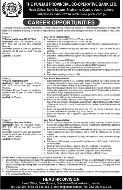 - PPCBL is looking for dynamic & high-achieving business leaders as VP/Deputy Head/In-charge AML/CFT Desk, VP/Deputy Head/In-charge CPU/AVP/Manager, and Operations Division. These positions are based in Head Office Lahore.