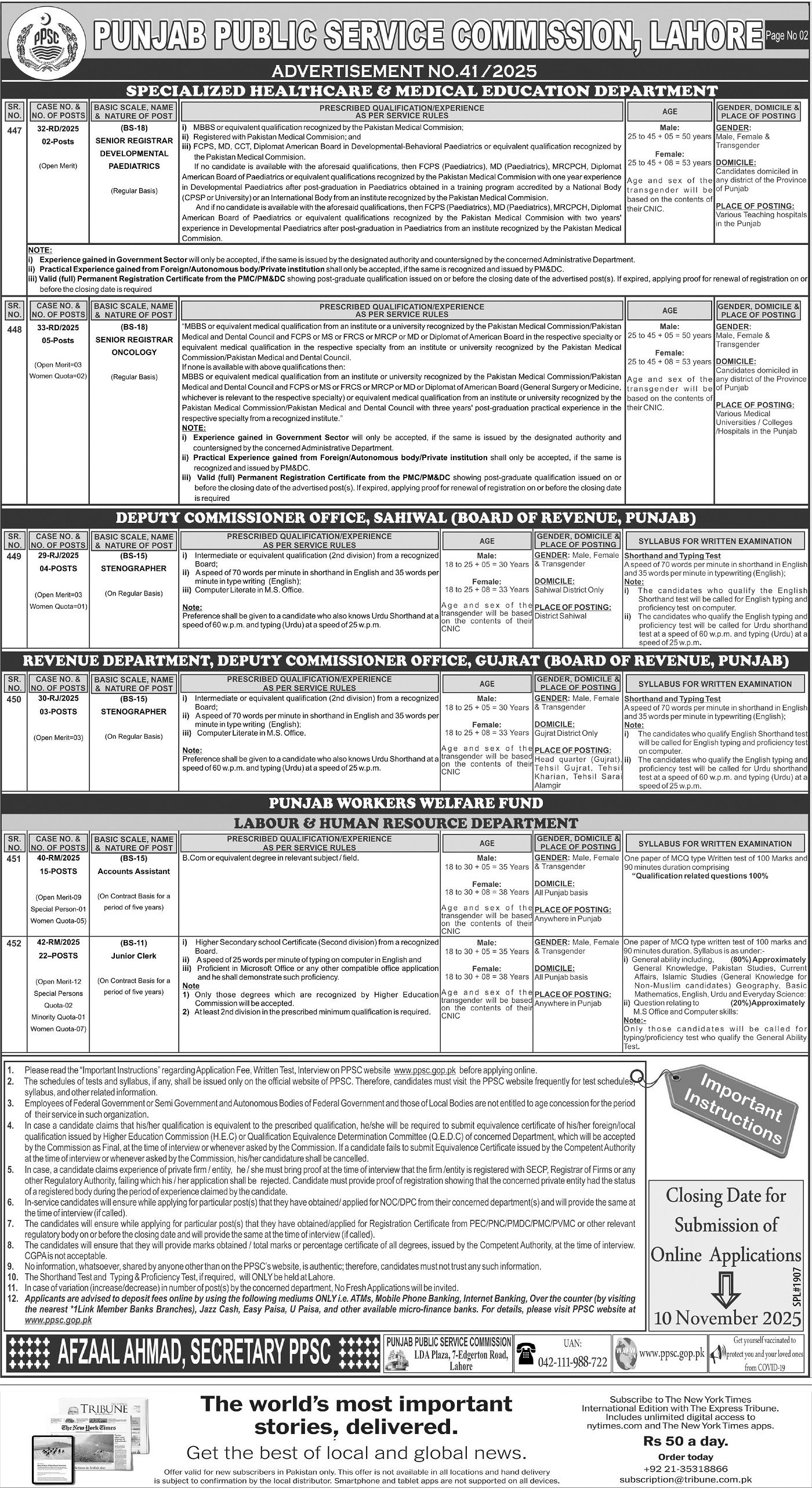 Punjab Public Service Commission PPSC Jobs 41/2025 announce the Permanent career opportunities for the post of See Below Ad in Punjab, Lahore for the fresh and experienced candidates on Permanent basis who have Check Advertisement degree. Posted date of this post is 26/10/2025 and the last date is 10/11/2025. if you are eligible for this job apply before due date.