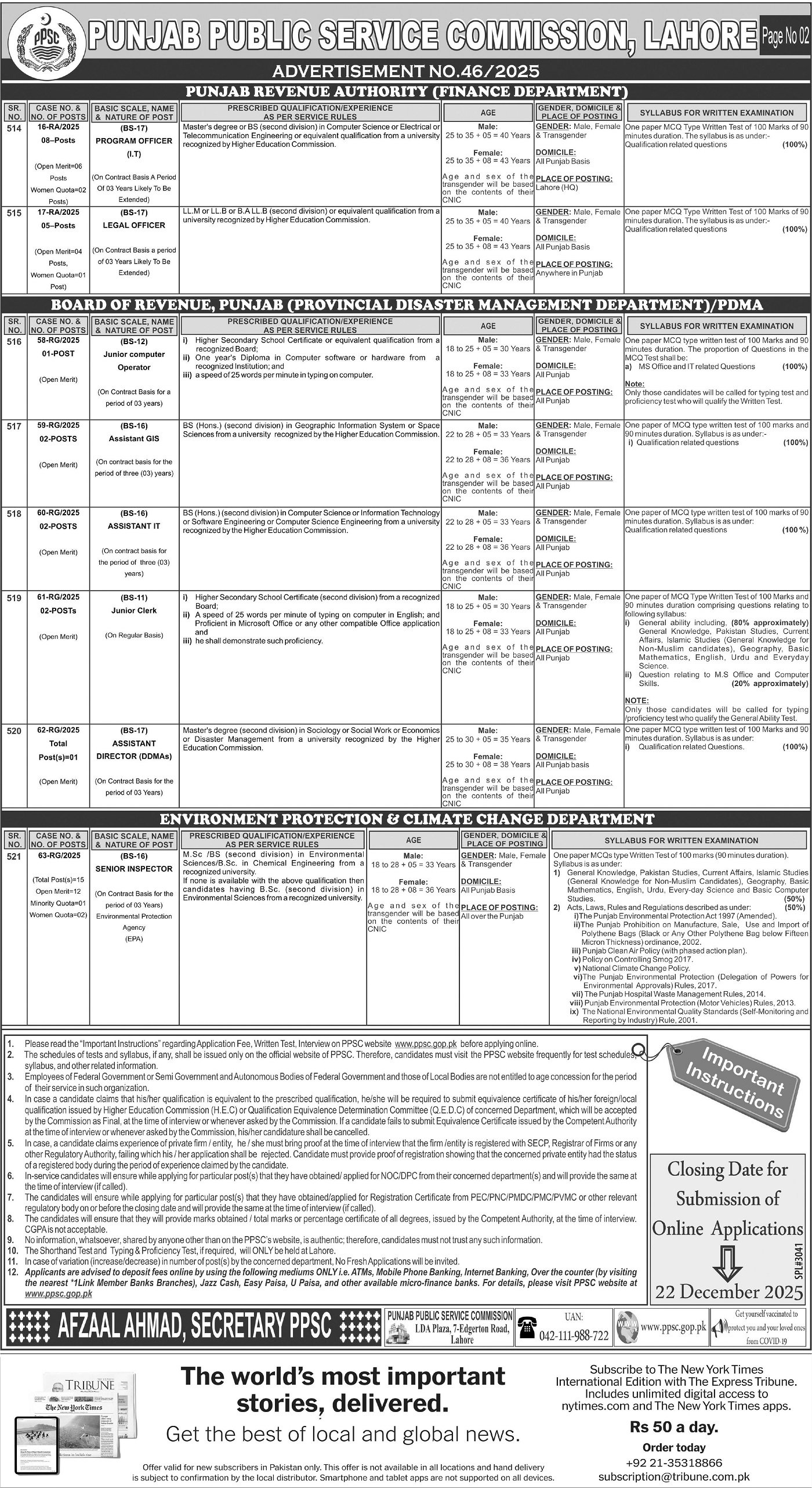 Punjab Public Service Commission PPSC Jobs 46/2025 announce the Permanent career opportunities for the post of See Below Ad in Punjab, Lahore for the fresh and experienced candidates on Permanent basis who have Check Advertisement degree. Posted date of this post is 05/12/2025 and the last date is 22/12/2025. if you are eligible for this job apply before due date.