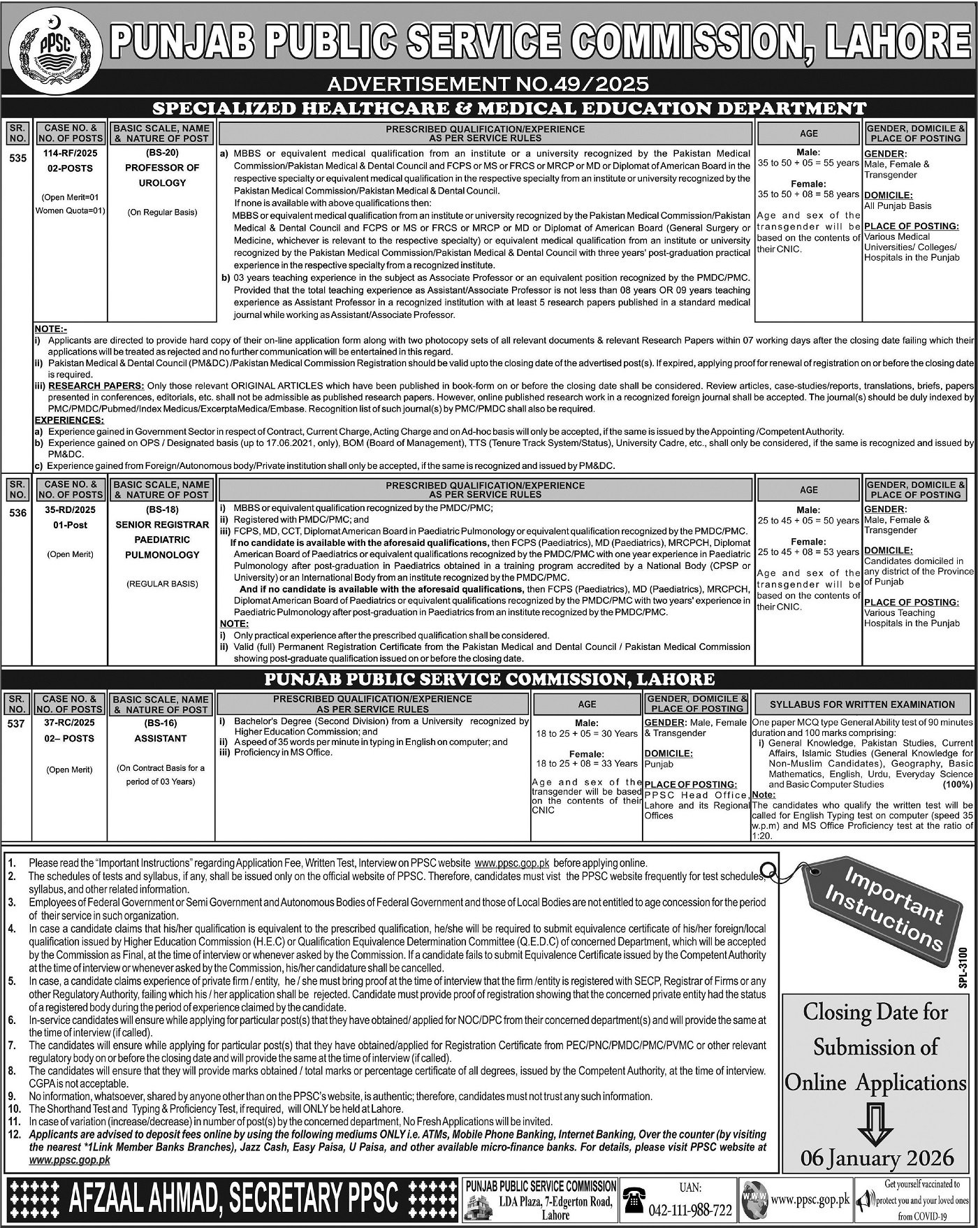 Punjab Public Service Commission PPSC Jobs 49/2025 announce the Contract career opportunities for the post of See Below Ad in Punjab, Lahore for the fresh and experienced candidates on Contract basis who have Check Advertisement degree. Posted date of this post is 21/12/2025 and the last date is 06/01/2026. if you are eligible for this job apply before due date.