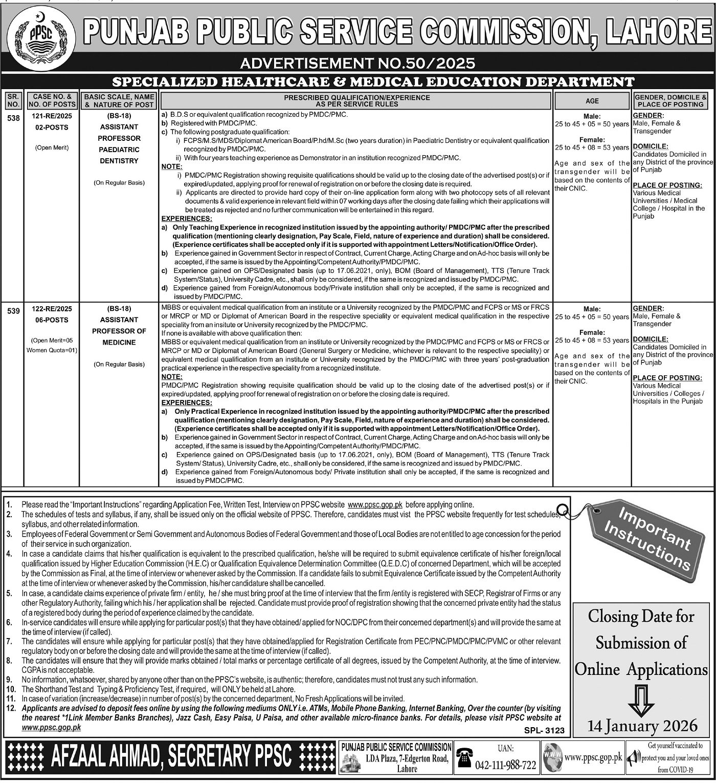 Punjab Public Service Commission PPSC Jobs 50/2025 announce the Permanent career opportunities for the post of See Below Ad in Punjab,Lahore for the fresh and experienced candidates on Permanent basis who have Check Advertisement degree. Posted date of this post is 30/12/2025 and the last date is 14/01/2026. if you are eligible for this job apply before due date.