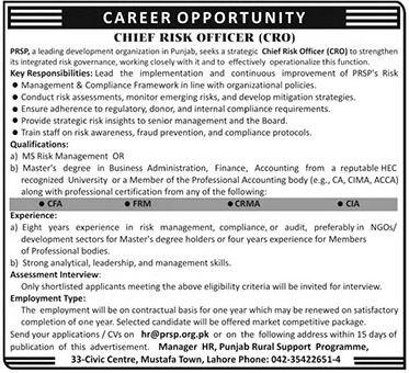 PRSP, a leading development organization in Punjab, seeks a strategic Chief Risk Officer (CRO) to strengthen its integrated risk governance, working closely with it and to effectively operationalize this function.