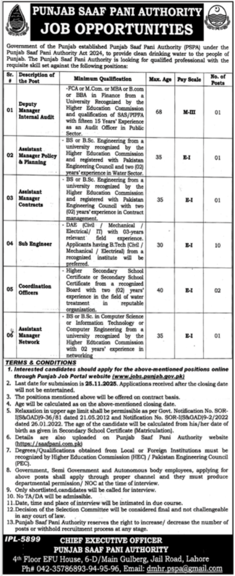 Punjab Saaf Pani Authority PSPA Lahore Jobs 2025 announce the Contract career opportunities for the post of See Below Ad in Punjab, Lahore for the fresh and experienced candidates on Contract basis who have Check Advertisement degree. Posted date of this post is 05/11/2025 and the last date is 25/11/2025. if you are eligible for this job apply before due date.